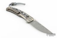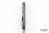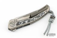 This Quantum by Shirogorov features a ZDI-E blade with notched thumbrest and flipper. The handle has a stonewashed with polished flats Titanium frame with White CarboTi presentation scale, backspacer, tip up titanium clip with hidden screws. Rides on MRBS, nice detent, lockup and blade seating. Comes with original box and COA. New condition.