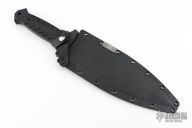 This Blue Line Fairgate by Blackside Customs features a black double edged blade (PSB27) with blue accents, has fullers, .163" blade stock and 2.719" blade depth, full tang construction with milled black G-10 scales. Comes with a kydex sheath with titanium logo plate. Comes with original box and COA dated "Microbatch 2024". New from maker.