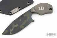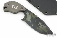This SLCC by Mick Strider features a black multicam blade with a notched thumbrest, .157" blade stock and 1.548" blade depth, full tang construction. The handle has checkered titanium scales. Comes with a kydex sheath, original box and COA dated 2024. New from maker!