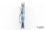 This knife by Spyderco features a satin finished blade with a thumbhole and notched thumb ramp/thumb disc.  The handle features blue aluminum scales over inlaid steel liner and a steel wire style tip up pocket clip. Comes with original box. Excellent condition.