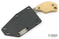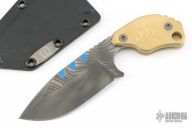 This SLCC by Mick Strider features a Beskar finished blade with a notched thumbrest, .157" blade stock and 1.548" blade depth, full tang construction. The handle has checkered brass scales. Comes with a kydex sheath, original box and COA dated 2024. New from maker!