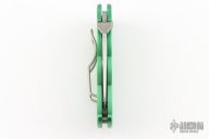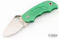 This knife by Spyderco features a satin finished blade with a thumbhole and notched thumb ramp/thumb disc.  The handle features green aluminum scales over inlaid steel liner and a steel wire style tip up pocket clip. Comes with original box. Excellent condition.