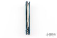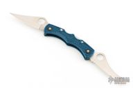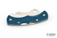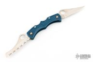 This Dyad Jr. by Spyderco features two satin finished blades, one is fully serrated and both have thumbholes. The handle has blue FRN scales, stainless steel liner and backspacers. Comes in an unlabeled white box. Excellent condition.