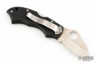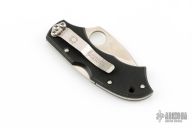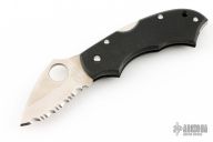 This Navigator by Spyderco features a satin finished blade with thumbhole and serrations. The handle has black g10 scales with stainless liners, and tip down stainless steel clip. Comes with the wrong Spyderco box. Excellent condition.