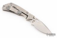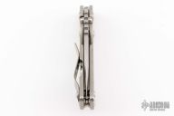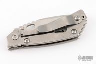 This PT by Mick Strider features a stonewashed blade with notched thumbrest and thumbhole. The handle has a stonewashed titanium frame with matching tip up clip. New condition.