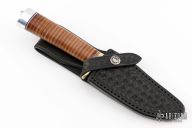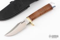 This Stanaback Special features a satin finished blade with sharpened top edge and notched thumbrest, .213" blade thickness and 1.173" blade depth, hidden tang construction. The handle has a brass guard, duralumin butt, stacked leather grip with red/white/blue spacers. Includes a hand tooled black leather sheath and original paper wrapping. New from maker!