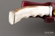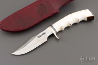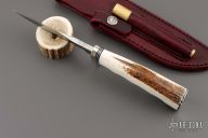 This Stanaback Special features a satin finished blade with sharpened top edge and notched thumbrest, .218" blade thickness and 1.146" blade depth, hidden tang construction. The handle has a nickel silver guard and butt, slab side finger groove stag grip with black/duralumin spacers. Includes a maroon leather sheath with sharpening steel and original paper wrapping. New from maker!