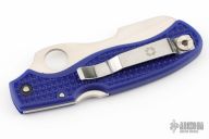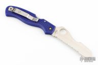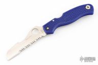 This Spyderco Rescue 93mm Features a satin finish sheepsfoot style blade with full serrations, thumb hole and notched thumb rest. The handle is comprised of blue FRN over a stainless steel lock back. Reversible black coated stainless steel tip up clip with hollow pin for lanyard attachment. Comes with original box and papers. Has some scratches on the clip otherwise Excellent condition.