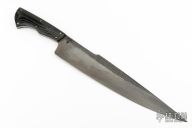 This knife by Neil Kamimura features an clip point point blade with false top edge and forge finished flats, .183" blade stock and 2.614" blade depth, full tapered tang construction. The handle has black canvas micarta scales and brass pins. Comes with a zipper case. Has light scratches and patina, good condition otherwise.