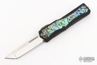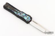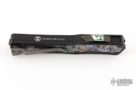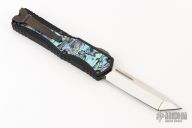 This Colossus by Heretic Knives features a mirror polished tanto blade with satin flats and fullers, notched thumbrest. The handle has a black aluminum frame with abalone inlays, stainless steel thumb slide with abalone inlay, stainless steel tip down clip. Comes with original box, zippered case and COA dated 5/22 and s/n 013. Excellent condition.