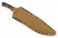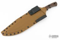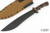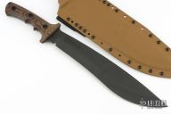 This Combat Machete from Jim Behring of Treeman Knives features a black coated recurve blade with swedge, .252" blade stock and 2.202" blade depth, full tang construction. The handle is comprised of textured and contoured black/green/brown canvas micarta, exposed tang pommel with lanyard hole and lanyard. Includes a kydex sheath with belt loops. Excellent condition.