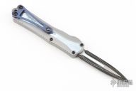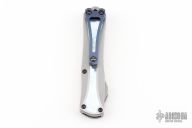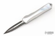 This Manticore S by Heretic Knives features a double-edged Baker Forge Double Shim Damascus blade with mother of pearl inlays in the flats. The handle has a two-tone stainless steel frame with mother of pearl inlays, stainless steel thumb slide with mother of pearl inlay, and a tip down blue anodized titanium clip with ball bearing. Comes with original box and zippered case. #013. Excellent condition.