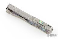 This Colossus by Heretic Knives features a mirror polished double edged blade with satin flats and fullers. The handle has a two-tone stainless steel frame with abalone inlays, stainless steel thumb slide with abalone inlay, stainless steel tip down clip. Comes with original box, zippered case and COA dated 11/23 and s/n 007. Excellent condition.