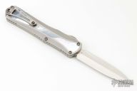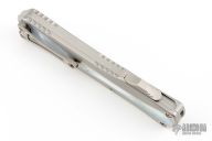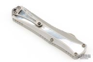 This Manticore X by Heretic Knives features a double-edged mirror polished blade. The handle has a two-tone stainless steel frame with mother of pearl inlays, stainless steel thumb slide with mother of pearl inlay, and a tip down titanium clip with ball bearing. Comes with original box and zippered case, and COA dated 08/21 and #013. Excellent condition.