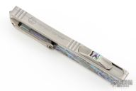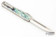 This Custom NYX by Heretic Knives features a mirror polished blade with fullers. The handle has a two-tone stainless steel frame with abalone inlays, titanium clip with ceramic ball insert, glass breaker at the butt. Comes with original box, zippered case and COA #007 and dated 06/2024. Excellent condition.