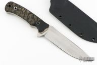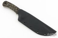 This "Contractor" by Dario Zadravec (Daracsteel) features a tumble finished drop point blade with notched thumbrest, .185" blade stock and 1.435" blade depth, full tang construction. The handle has black G-10 bolsters, black canvas micarta scales, tan G-10 liners, lanyard hole. Comes with kydex sheath. Excellent condition. Comes with COA dated January 15, 2015. Comes with TekLok and auxiliary pouch for the sheath.
