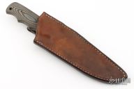 This knife by Ricky Fowler features a rustic finished drop point blade with notched thumbrest, .126" blade stock and 1.173" blade depth, full tang construction with green/tan linen micarta scales. Comes with a brow3n leather sheath. Excellent condition. #1407