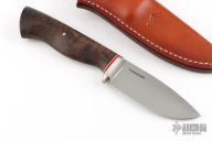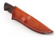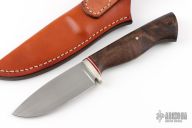 This knife by Warren Thacker features a hand rub satin finished blade with .169" blade stock and 1.415" blade depth, hidden tang construction. The handle has a nickel silver guard with a wood grip. Comes with a hand tooled brown leather sheath. New from maker!
