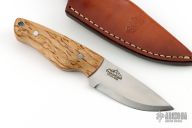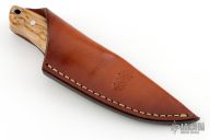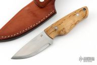 This hunter by Warren Thacker features a scandi ground satin finished blade with a full tang construction.  .107" Blade Stock.  1.12"Blade  Depth.  The handle has contoured wood scales over red liners. Includes a brown leather sheath.  New from maker!