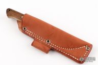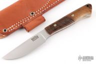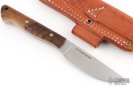This fixed blade from Bark River Knives features a satin finish drop point blade with a full face grind, .139" blade stock and .857" blade depth. The handle has black cross cut Zebra wood scales, nickel silver pins, over full tang construction. Lanyard hole on pommel. Includes leather sheath and original box. Excellent condition.