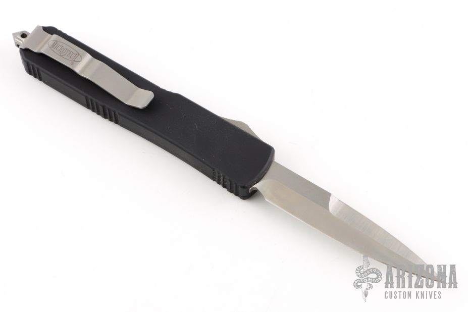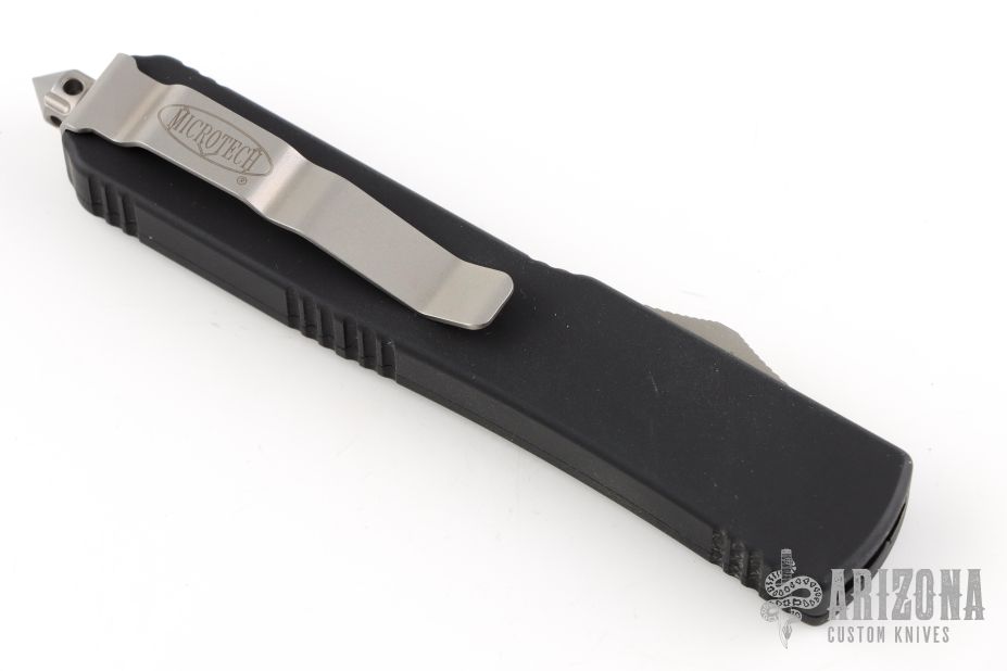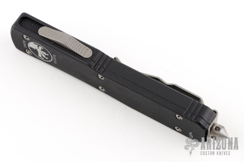 This Ultratech OTF automatic features a bayonet grind satin double edge blade with a standard edge and a black anodized aluminum handle. Stainless steel clip. Glass breaker. Serial number 51078 and dated 01/2015. Comes with original box and papers. Has a couple light scuffs and scratches, excellent condition otherwise.