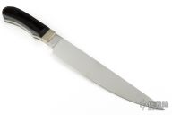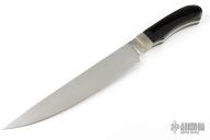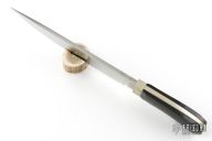 This knife by David Broadwell features a hand rub satin finished blade with .245" blade stock and 1.483" blade depth, hidden/frame tang construction. The handle has a fileworked nickel silver guard and frame with buffalo horn scales. Comes with a zippered case. Has a couple light scratches, otherwise excellent condition.