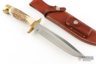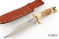 "This Randall Knives Model 1 was made famous by Allied combat troops in World War II and has since been widely used in all theaters of war." .247" blade stock. 1.185" blade depth, satin finish blade with sharpened top edge, hidden tang construction. The handle has a brass guard and butt with a stag grip and red/white/blue spacers. Includes original sheath. Has some patina, excellent condition otherwise.