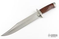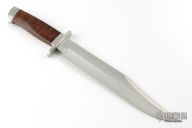 This knife by David Broadwell features a hand rub satin finished blade with a false top edge, .235" blade stock and 1.467" blade depth, hidden tang construction. The handle has a stainless steel guard and butt with fileworked spacers, walnut grip. Comes with a zippered case. Excellent condition.