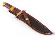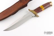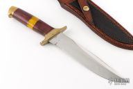 This fighter by Dave Ricke features a mirror finished blade with false top edge, .251" blade stock and 1.404" blade depth, hidden tang construction. The handle has a brass guard and butt, wood and amber grip with red/white/black/brass spacers. Comes with a hand tooled brown leather sheath with exotic leather overlay, and a zippered case. Has some patina on the brass, otherwise excellent condition.