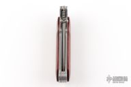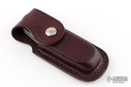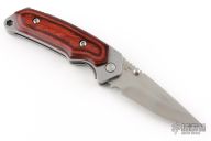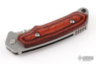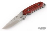 This Model 277 Alpha Hunter Linerlock Folder has a satin finished drop point blade with dual thumbstuds and a notched thumbrest. The handle has rosewood scales over a stainless steel frame.  Includes a Buck brown leather belt sheath and original box. BOS heat treated S30-V. Has some scuffs and some grime on the blade. Great condition otherwise.