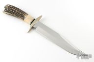 This Bowie by Ken McFall features a mirror polished blade with a nearly sharpened top edge, .194" blade stock and 1.514" depth, hidden tang construction. The handle has a nickel silver guard and butt, stag grip with black linen micarta/nickel silver/oosic spacers. Comes with a zippered case. Excellent condition.