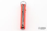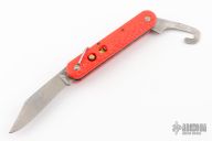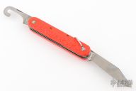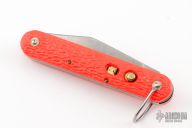 This knife by Camillus features a clip point blade. The handle has orange jigged scales, stainless steel liners and backspacer. Has some light scratches and blade play, otherwise excellent condition.