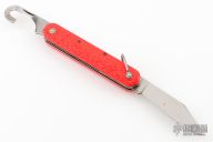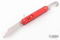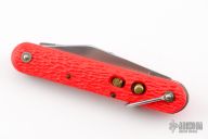 This knife by Camillus features a clip point blade. The handle has orange jigged scales, stainless steel liners and backspacer. Has some light scratches and blade play, otherwise excellent condition.