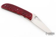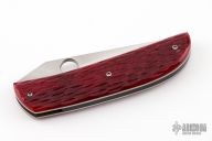 This folding linerlock from A.T. Barr features a hand rub satin finished blade with thumbhole and notched thumb rest. The handle has red jigged bone scales over titanium liners and black paper micarta backspacer. Has a few light scratches, otherwise excellent condition. Comes with a black nylon sheath.