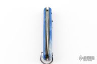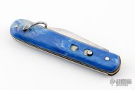 This knife by Shur-Snap features a polished clip point blade with false top edge. The handle has blue/white acrylic scales with brass liners, steel backspacer, lanyard bail. Has scratches, has blade play, otherwise good condition for its age.