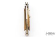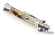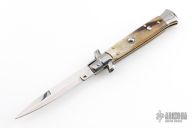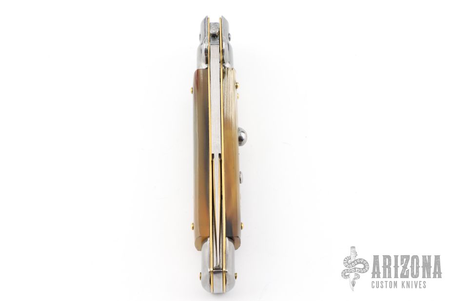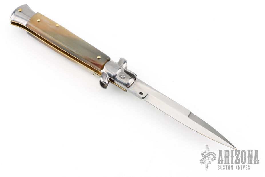 This 9" Picklock by Frank Beltrame features a tumbled bayonet ground blade. The handle has stainless steel bolsters, front and rear, honey horn scales, brass liners and stainless steel spring. Excellent condition.