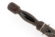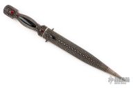 This Dagger by Zaza Revishvili features a Damascus double edged blade, .162" blade stock and .928" blade depth, hidden tang construction. The handle has a silver frame with sterling silver filigree overlays done by Zaza Revishvili, has garnet and jet black stone inlays. The handle and the scabbard match. Excellent condition. Comes with zippered case. Amazing detail! True work of art that could be the corner stone of any collection! Zaza's work is second to none!