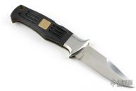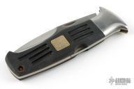 This AL MAR SERE Model 3003 Tactical Folding Knife features a satin finished spear point blade with false top edge. The handle has stainless steel bolsters, textured black Neoprene with the RARE and limited GOLD Al Mar Chop inlaid on both sides, brass liners, stainless steel spring and backspacer, lanyard hole. Excellent condition.
