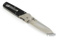 This Hatamoto linerlock by Cold Steel has a high satin finished San Mai III stainless steel tanto blade with dual thumb studs and notched thumb rest. Handle is black G10 over titanium liners and satin finished titanium bolsters. Stainless steel tip up reversible clip and lanyard hole. Excellent condition. Comes with original box and aluminum case. Still has the protective covers on the bolsters.