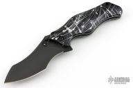 This Offset 1597 assisted opening flipper has a black MIM 440C recurve tanto blade with dual thumb studs (thumb stud lock release) and notched thumb rest. Handle is fluted black aluminum with splash paint-style graphics. Stainless steel liners, black aluminum splash painted spacer, polished stainless steel tip town clip, and lanyard hole. Comes with original box, zippered case and papers. Excellent condition.