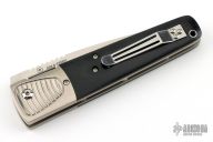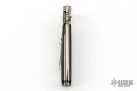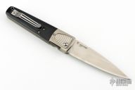 This Caledonian Edge from Cold Steel has a satin finished San Mai III stainless steel spear point blade with single thumb stud and notched thumb rest. Handle is black linen micarta over titanium liners, titanium bolsters, and lanyard hole. Excellent condition. Comes with original box and metal case.