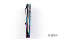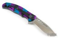 This Boa assisted opening linerlock is a Ken Onion design made by Kershaw, it has a satin finished blade with flipper. The handle has multi-color aluminum dimpled scales and backspacer, stainless steel liners and tip down clip. Comes with original box and papers. Excellent condition.