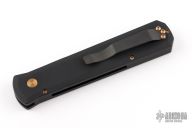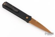 This Godfather by Pro-Tech features a satin rose gold finished blade with false top edge. The handle has a black aluminum handle with black tip up stainless steel clip. Comes with original box and pouch. Has a couple light scuffs and scratches, excellent condition otherwise.