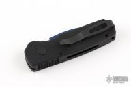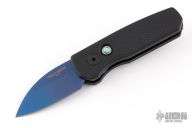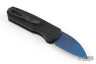 This Runt by Pro-Tech features a sapphire blue Magnacut blade.  The handle features a textured black aluminum frame with milled thumbrest, a black stainless steel tip up pocket clip with an abalone inlaid push button. Comes with original box, pouch and papers. Excellent condition.