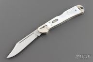 This Mini Copperlock by Case Knives features polished blade with nail nick. The handle has nickel silver bolsters and cap, mother of pearl covers, nickel silver liners, stainless spacer and rocker bar. Comes with original box. Has some scuffs and patina, otherwise Excellent condition.