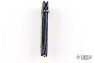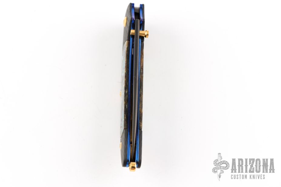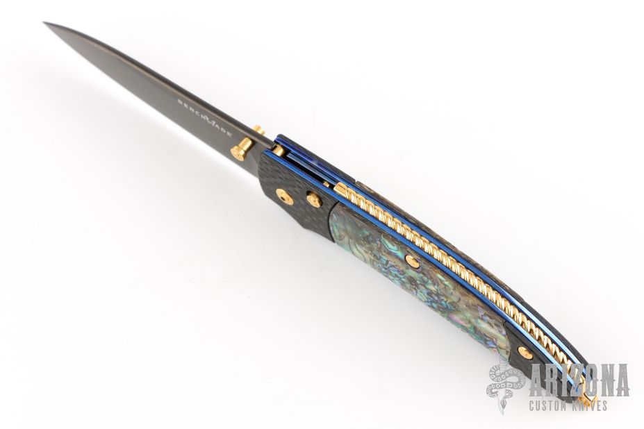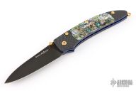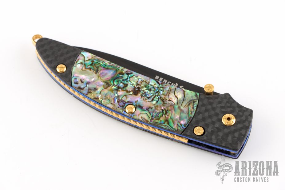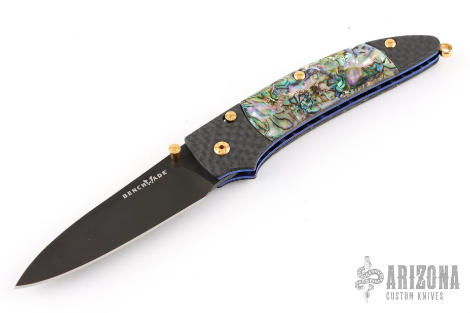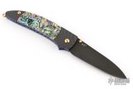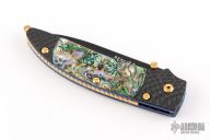 This 480-131 Shoki Nak-Lok from Benchmade features a black DLC coated drop point blade with gold plated thumb stud. The handle is comprised of carbon fiber bolsters and pommel with abalone inlay over jeweled and anodized titanium liners and gold plated and fileworked backspacer. Gold plated lanyard bail and hardware. Comes with original box, clamshell case, and papers. Excellent condition. Marked #37 on blade.