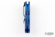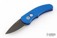 This is a Runt J4 "Jalapeno" by Pro-Tech featuring a blue handle and a black blade. Coil spring. California legal. PR2 s/n 791. Excellent condition. Comes with original box and papers.