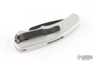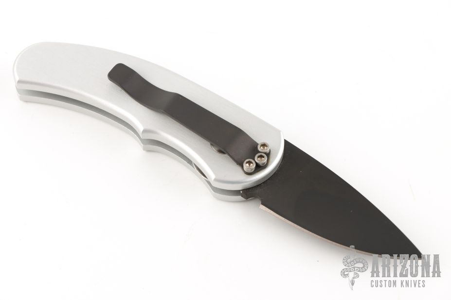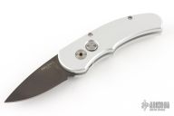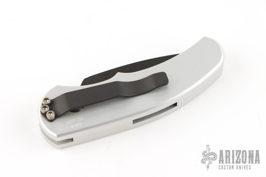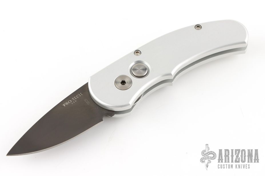 This is a Runt J4 "Jalapeno" by Pro-Tech featuring a silver handle and a black blade. Coil spring. California legal. PR2 s/n 354. Excellent condition. Comes with original box and papers.