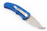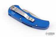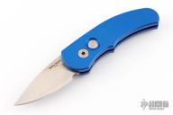 This is a Runt J4 "Jalapeno" by Pro-Tech featuring a blue handle and a satin blade. Coil spring. California legal. PR2 and s/n 773. Excellent condition. Comes with original box and papers.