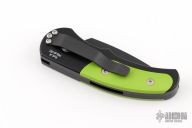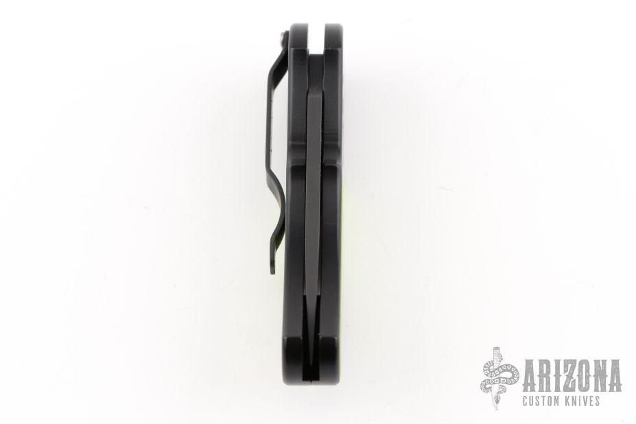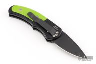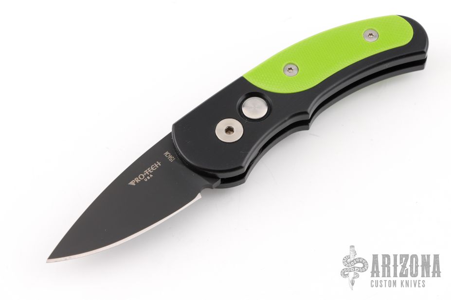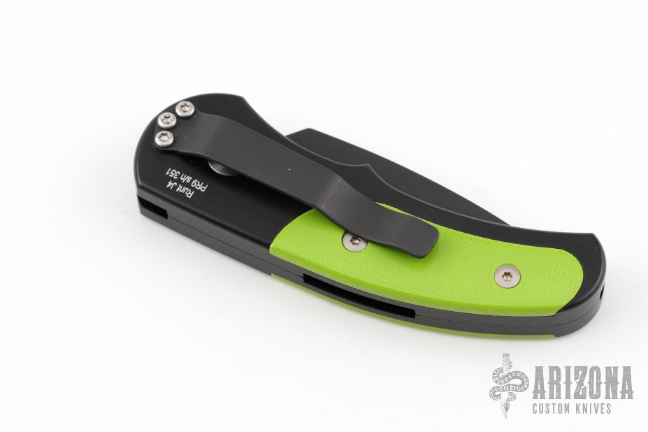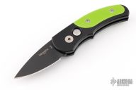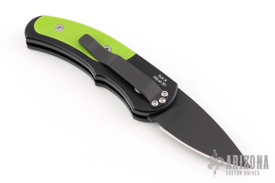 This is a Runt J4 "Jalapeno" by Pro-Tech featuring a black handle with neon green G-10 inlays and a black blade. Coil spring. California legal. PR9 and s/n 351. Excellent condition. Comes with original box and papers.